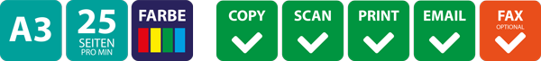 * Unser Angebote richten sich ausschließlich an Gewerbetreibende, Freiberufler, Vereine und Behörden. Es erfolgt kein Verkauf an Verbraucher/Endkunden sprich Privatpersonen im Sinne des § 13 BGB. Die monatlichen Raten beziehen sich auf Leasing-/Mietangebote mit einer Laufzeit von 60 Monaten (A4-Geräte 36 Monate) und bei gleichzeitigem Abschluss eines individuell angepassten Wartungsvertrages. Alle aufgeführten Preise sind ab Lager Dresden und verstehen sich zuzüglich der gesetzlichen Mehrwertsteuer. Abbildungen können Sonderausstattungen beinhalten.